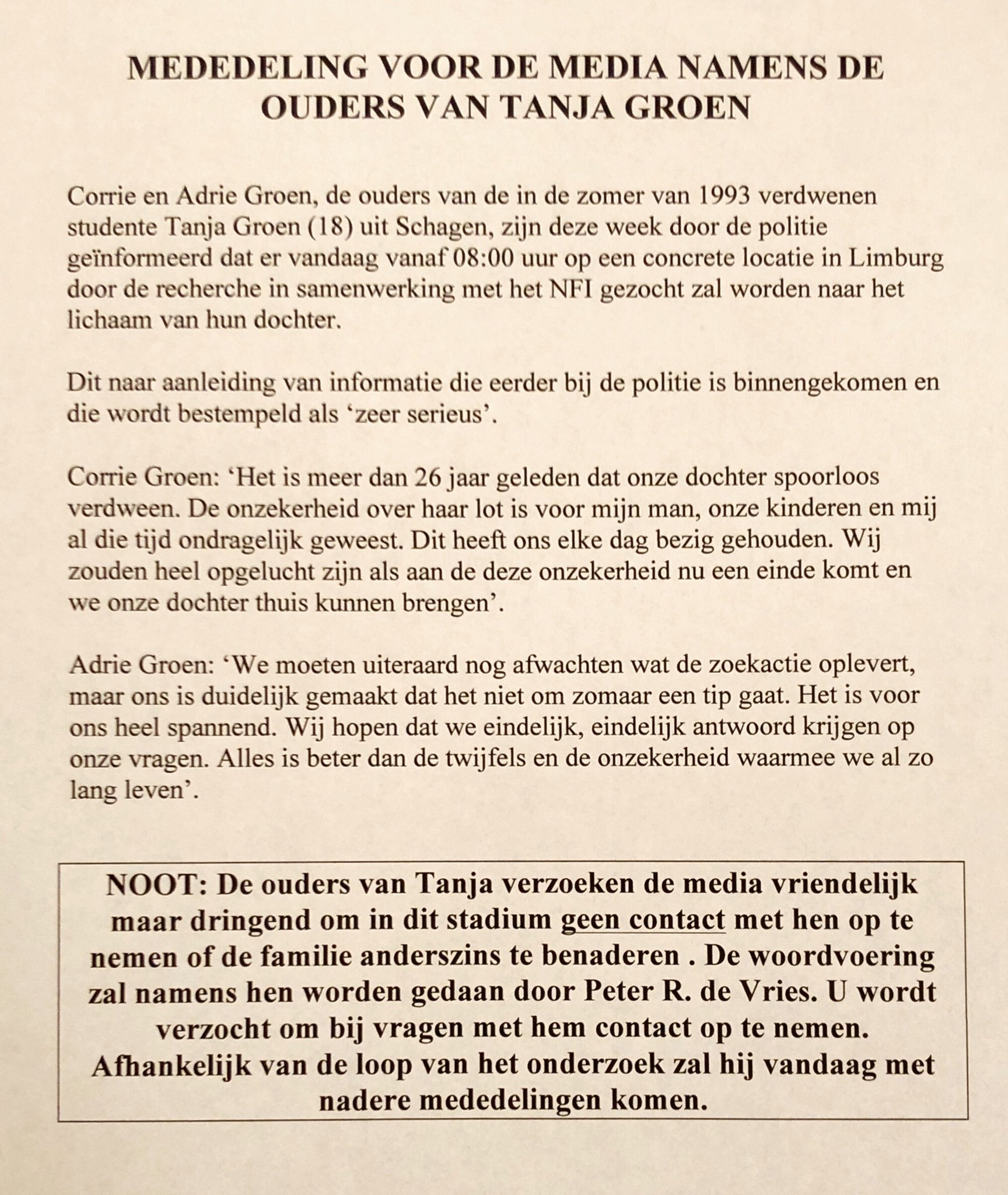 Het is meer dan 26 jaar geleden dat onze. Ouders tanja geïnformeerd de ouders van tanja zijn door projectleider cold case team limburg, bob willemsen, geïnformeerd over deze nieuwe ontwikkelingen in het onderzoek naar de verdwijning van. Maar vooral voor de ouders van tanja is dit. Tanja groen verdween in 1993 spoorloos en haar lichaam werd nooit gevonden. Voor de familie van tanja houdt de zoektocht nooit op.